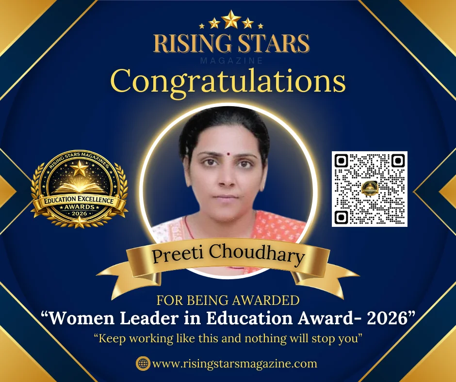 In the ever-evolving world of education and scientific research, women leaders are playing a transformative role in shaping knowledge and innovation. Recognizing exceptional contribution in this domain, Rising Stars Magazine proudly presents the Women Leader in Education Award 2026 to Preeti Choudhary from Jodhpur, Rajasthan, for her outstanding achievements in zoological research, teaching, and academic excellence.